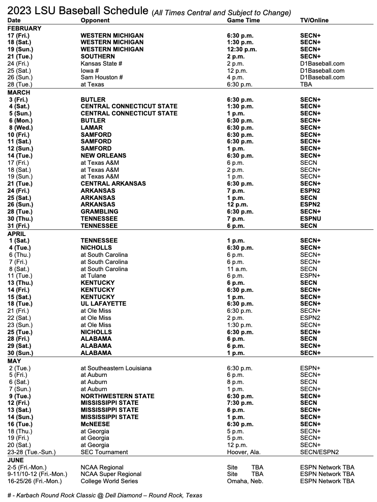 See the 2023 schedule with TV listings here: 2023 LSU Baseball Schedule