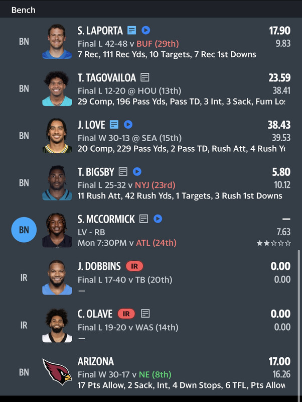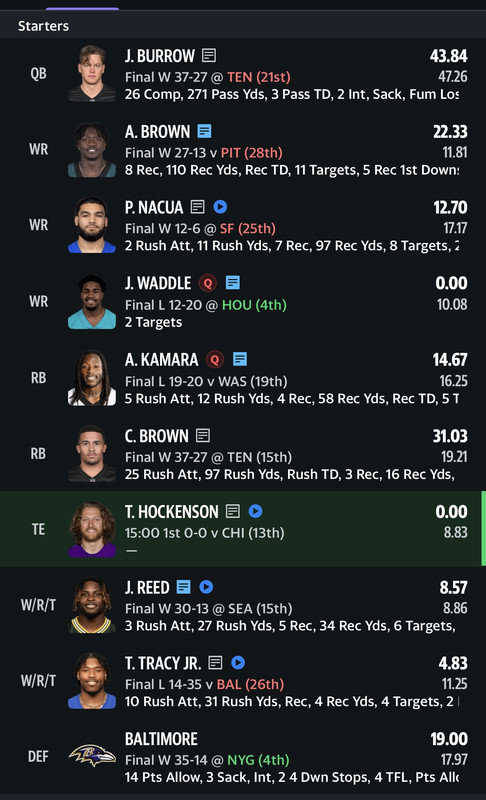 Went up against an opponent who earlier wanted me trade him Henry and Adams for Bucky Irving and Lamb. This is when Henry was number 1 RB and Irving was splitting time with White. He had Josh Allen who thankfully laid an egg and BTJ. Also McBride laid an egg for him. Up 5 and he is done while I have GB D ( no negative points for defenses so even if 0 I still win).