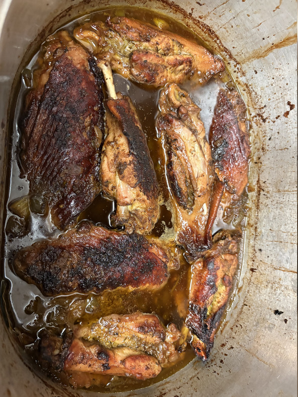 I mixed up a recipe from several online sources, including the one posted above. I added jalapeño to the stuffing mix. Went pretty heavy on thyme in the seasoning mix. Three Bay leaves in the brazing liquid.
