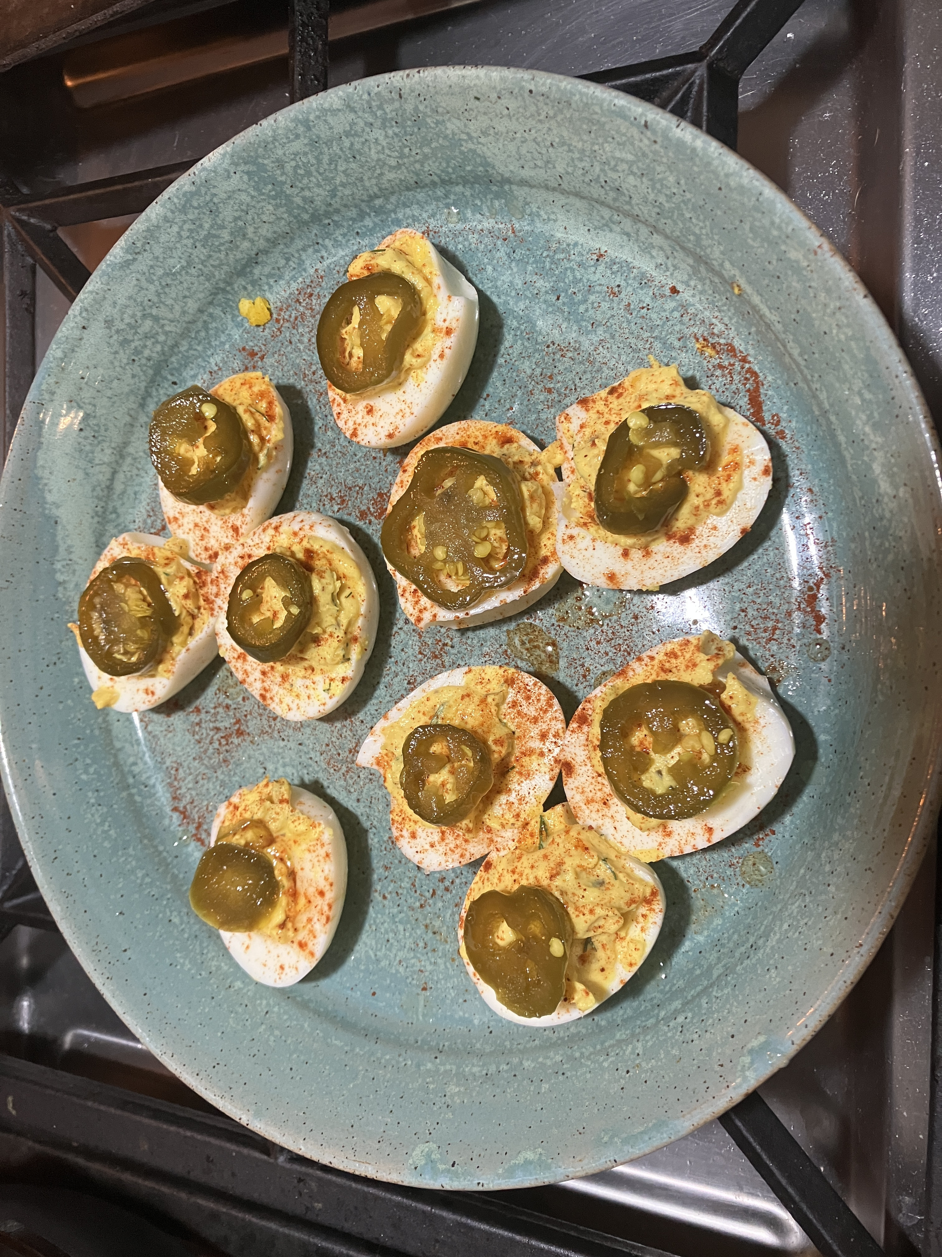The yolks + salt, pepper, mayo, apple cider vinegar, and paprika on top. Basic, tangy, and delicious.