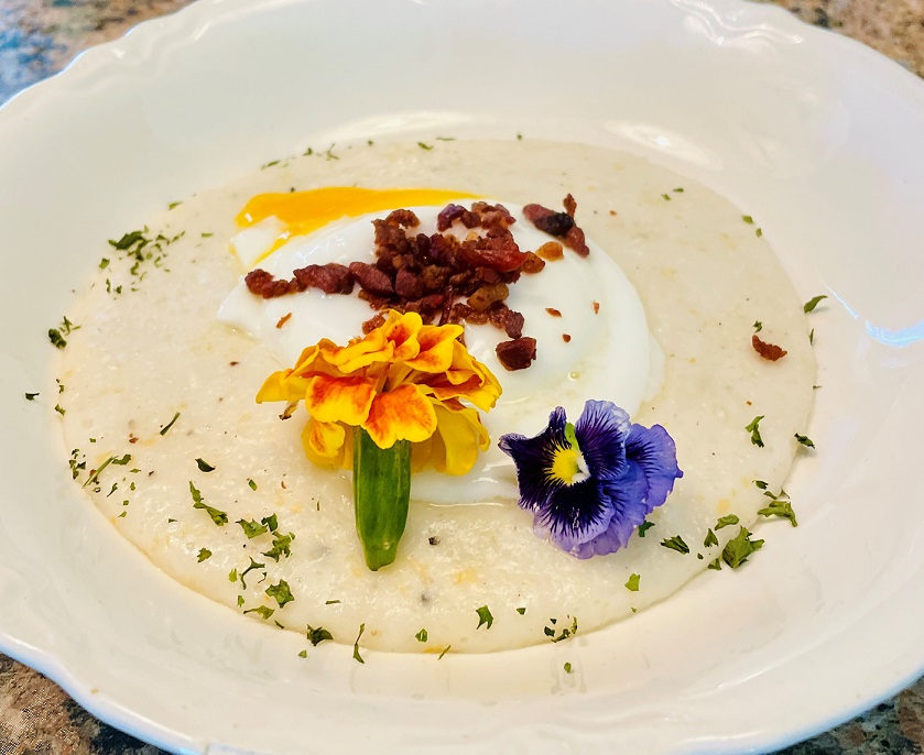 Rice, fried softshell, boudin stuffed chicken, with crawfish etoufee poured on top.