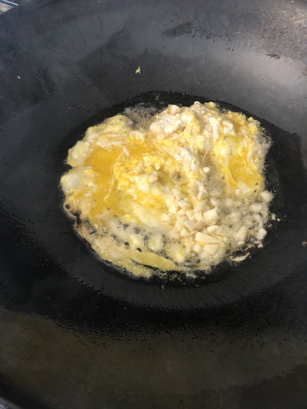 Scramble the eggs for 5 seconds. Add chopped garlic.