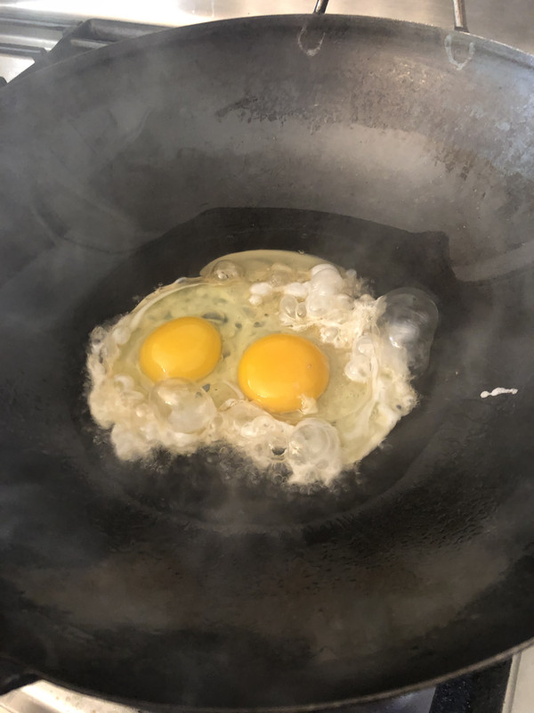 high heat a wok or pan and add 2 tablespoons of render bacon fat. I use Bacon Up brand. I’ve also used lard and oil before and rendered bacon fat>lard>oil.