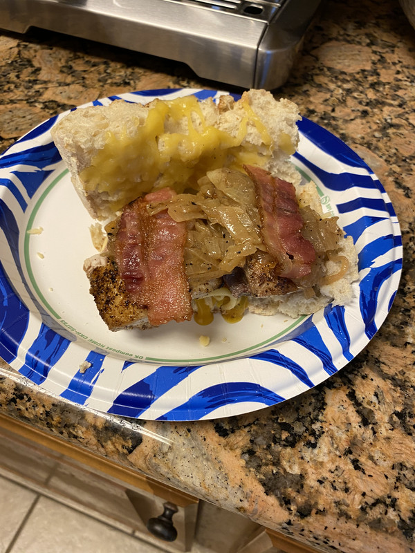 Blackened Mahi-mahi sandwiches topped with Gouda cheese, caramelized onions, and bacon on ciabatta.