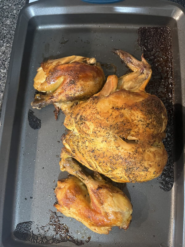 Whole chicken in the crockpot then broiled in the oven to crisp up skin. Will make chicken and rice and chicken salad. Returned the bones to the juices in the pot and will simmer over night and strain in the morning for stock.