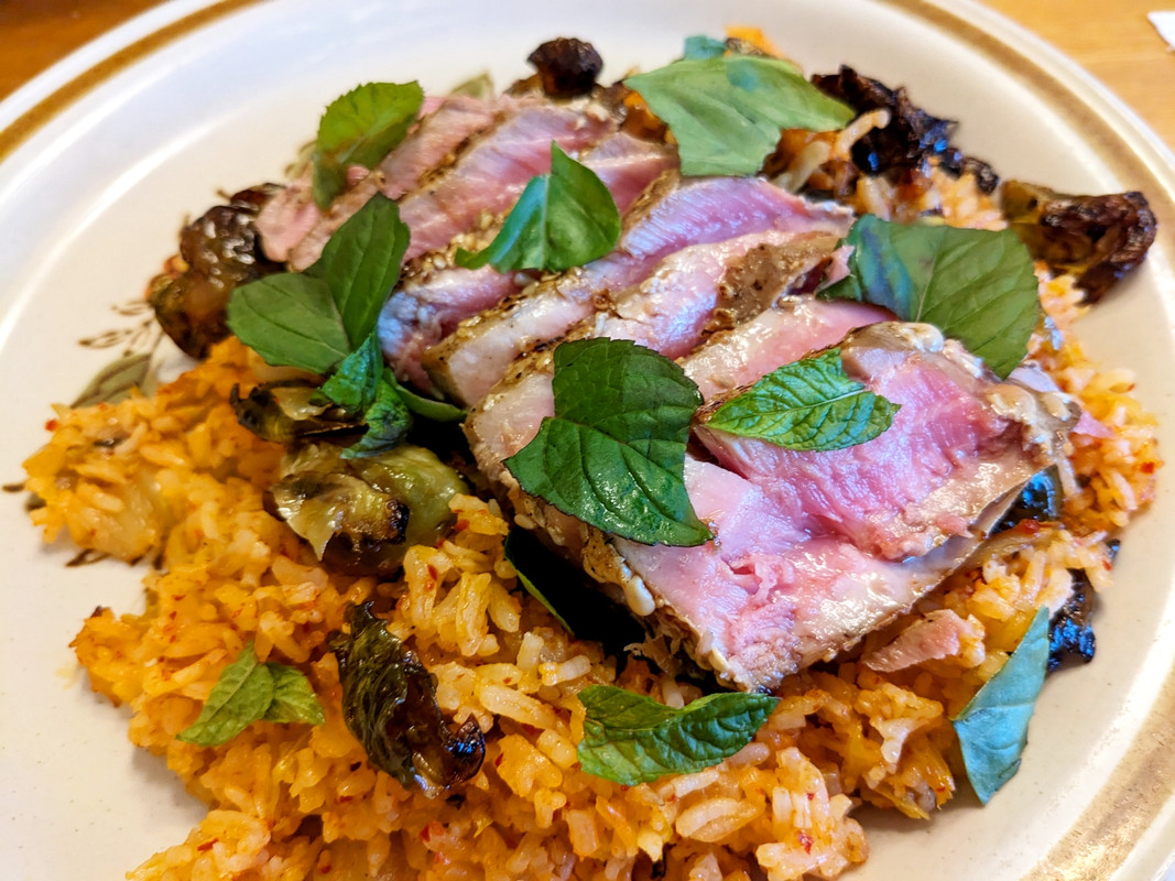 Kimchi fried rice with roasted Brussels and tuna