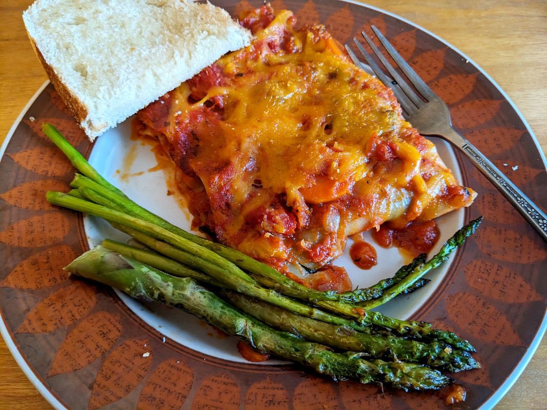 Veggie lasagna and asparagus from the garden