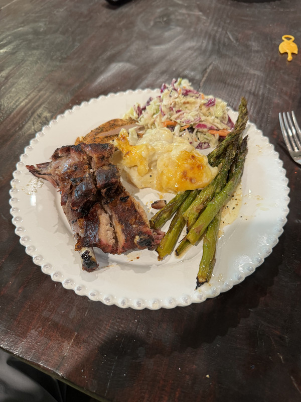 Did Father’s Day a day early since my son has to be back at camp for 12:00 tomorrow. Smoked Ribs & chicken breast, cole slaw, asparagus and Sam’s Club’s finest Au Gratins- they were damn delicious, along with the rest of it! Washed down with a nice glass of spiked sweet tea with the juiciest lime I’be ever squeezed.