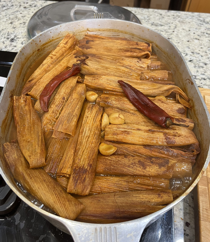 Filled a big Magnalite oval roaster - 5 layers, about 125 tamales. Simmered for a couple of hours.