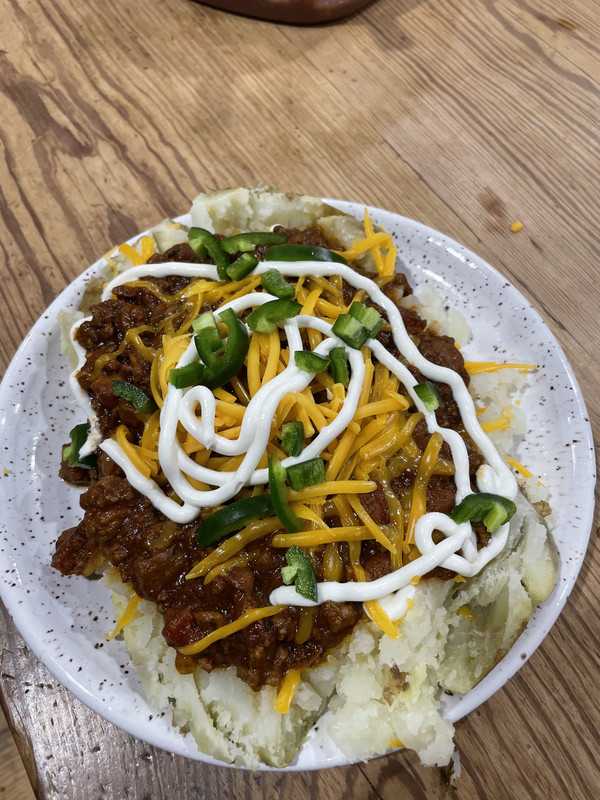 Had some chili leftover from last night. Baked a potato, topped it with chili, cheese, sour cream, and jalapeños.