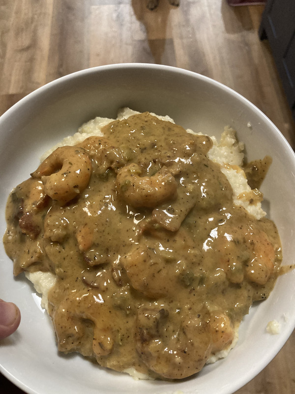 Shrimp and grits. I put too many shrimp in my bowl. I feel like I’m about to pop.