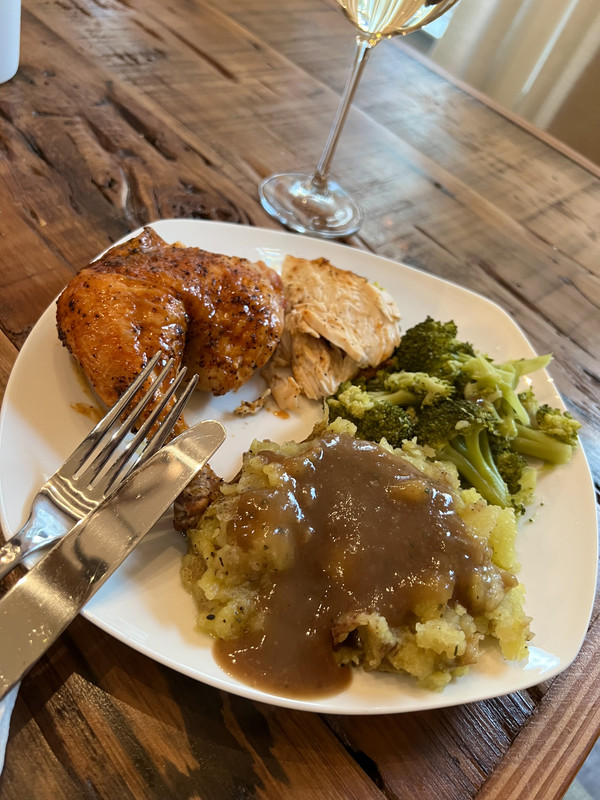 Buffalo lemon pepper chicken, crab boil broccoli, gold taters and gravy, white malbec