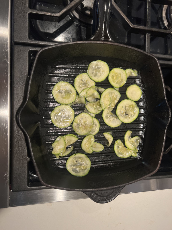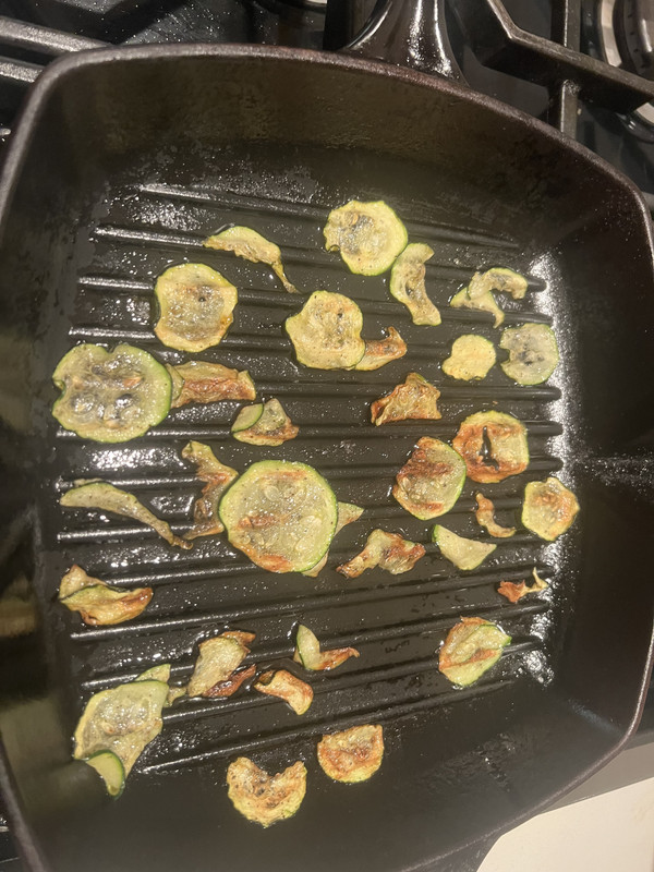 My favorite snack to make with Zucchini is fairly simple and delicious. Start with a whole zucchini, thinly slice, toss with salt, pepper, and olive oil in a bowl. Turn your gas stove on as low as it’ll go (don’t simmer) and spread zucchini. Cook until chips become slightly crispy. End result looks something like this.