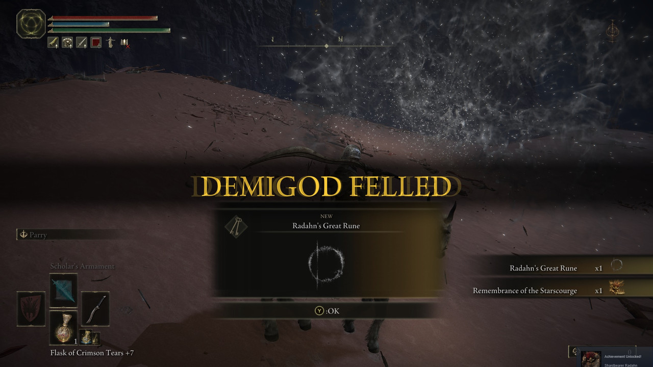 In my first full playthrough at release, I was forced to spam the shite out of the blasphemous blade's skill in order to beat the last few bosses. This time I used more strategies, switching between Rivers of Blood, Bloodhound Fang (using the ice grease and rot grease), and Dragon King's Crag Blade. I still relied on summon ashes but alternated a little more between the Dung Eater, Tiche, and Mimic depending on the boss. It was a much more satisfying playthrough where I felt I used more skill to complete the game rather than spamming an OP weapon.