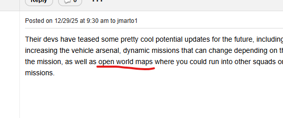Their devs have teased some pretty cool potential updates for the future, including 8 person missions, increasing the vehicle arsenal, dynamic missions that can change depending on the intel you uncover during the mission, as well as open world maps where you could run into other squads on the same planet on separate missions.
