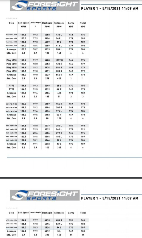 Here's my data for my 7 iron. Hitting into a $20K shot tracker is worth the money. He has me on the Nippon Modus 105x shafts and either the Mizuno 921 HMB, Callaway Apex, or the Taylormade P770s for heads. I was getting fatigued so I'll be going back next week to hit those three fresh for better readings. I hit about 12 different club heads and then made a second pass at what I hit the best. He was also really dialed in on my swing within a few minutes. I was hitting off the toe and my lie angle was too low. Hilariously enough when he adjusted the irons I was swinging to my swing I started hitting a high fade as opposed to a draw with my current set. I'm a numbers guy and like the physics of golf when it is explained to me. Just thought I'd share