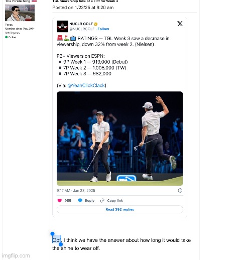 Clearly you never imagined LIV ratings would be this bad or you wouldn’t have made fun of TGL ratings that were actually higher here