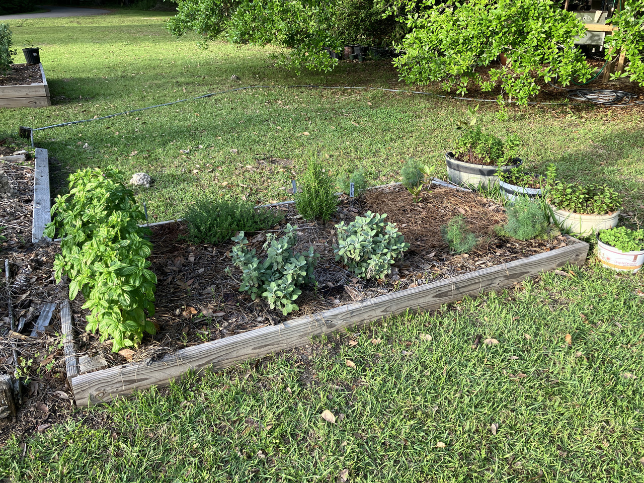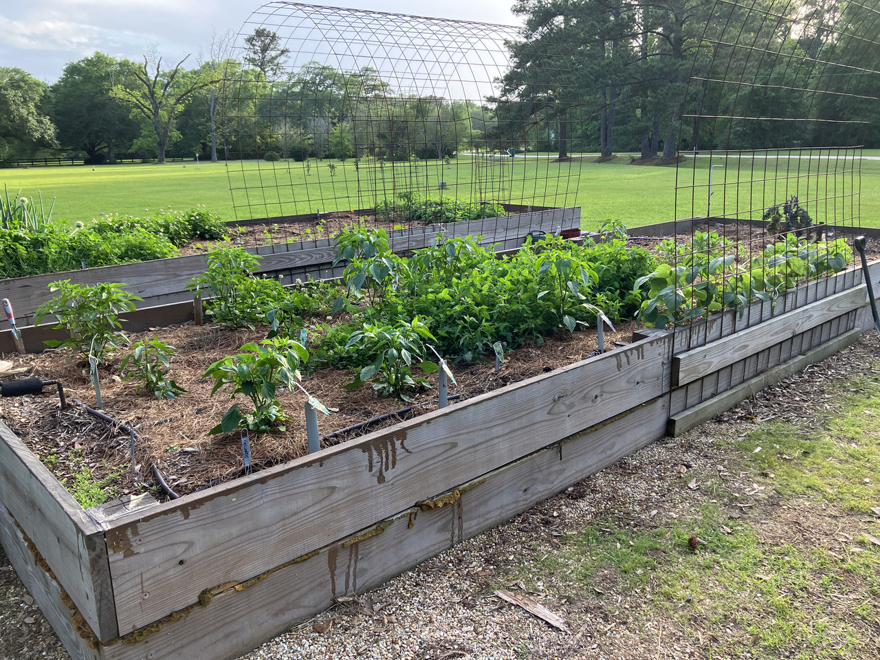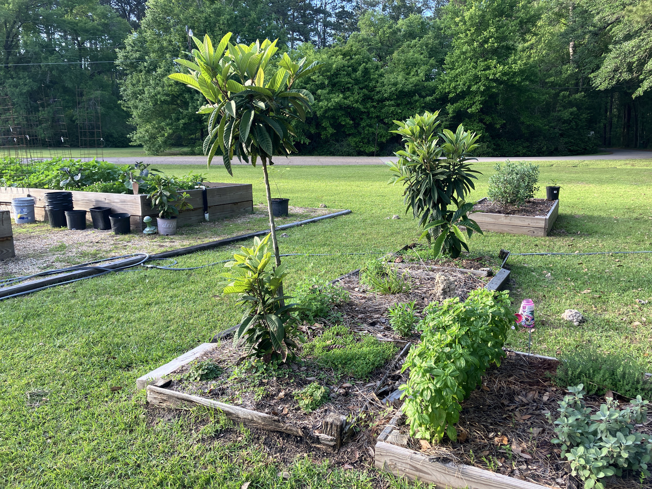 a grid of plastic drip hose in each bed. It works but it isn’t great for seeds or newly planted transplants so I hand water until everything is established. I should have used spray hose
