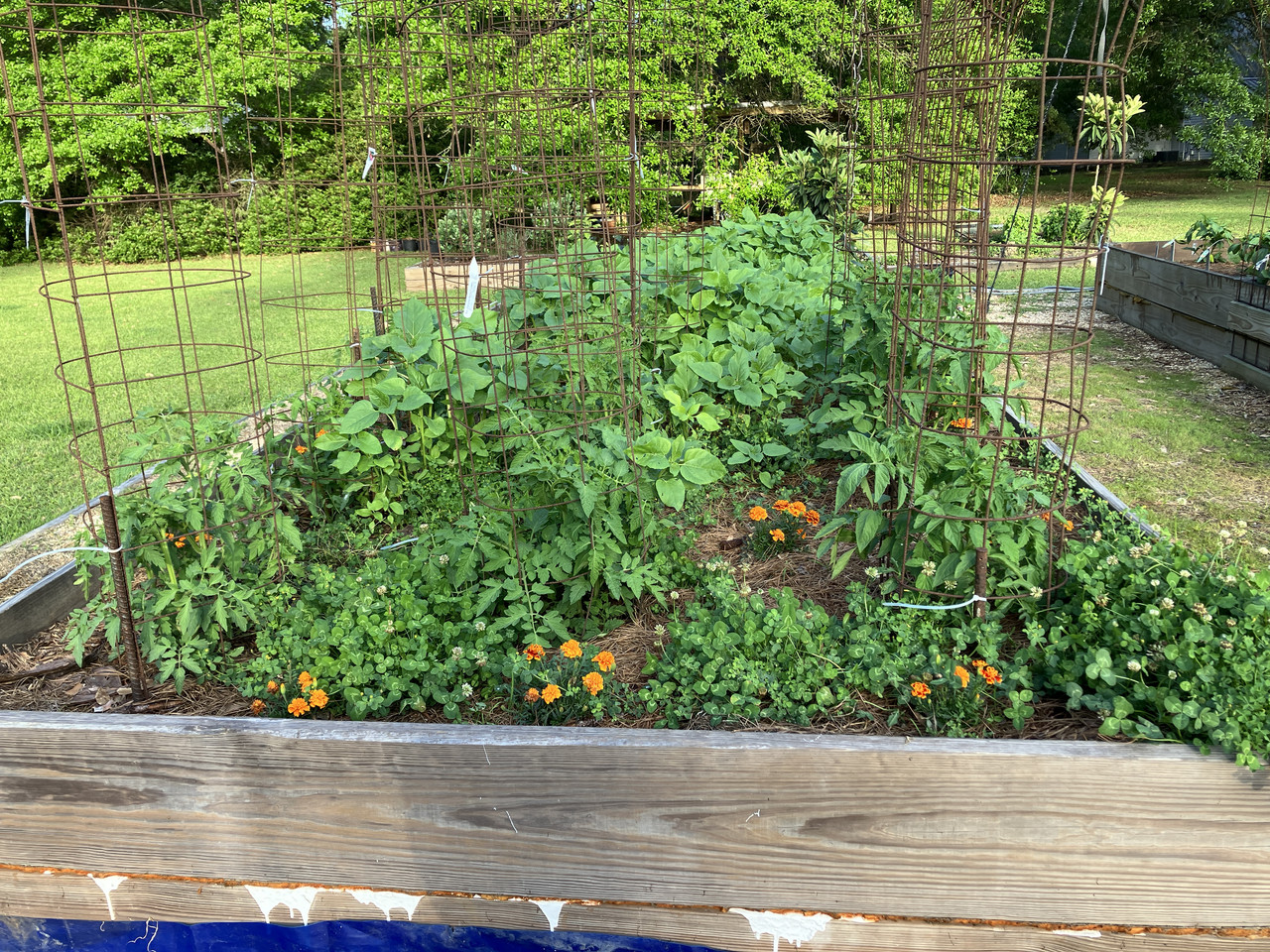 My beefsteaks are loaded with tomatoes. the pole beans are 2 feet past my 8' trellis and have baby beans on them. the bell peppers are the best I have ever grown, cucumbers have fruit on them, strawberries getting picked every other day.