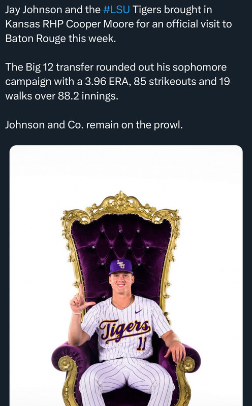 Kansas fan here, and Moore is the real deal. Was the actual number one pitching in the second spot. Gets ahead in almost every at bat, only gave up five HR’s in 15 starts, struck out 7+ in those starts. Think he would have a lot of success at LSU if he doesn’t sign out of the draft.