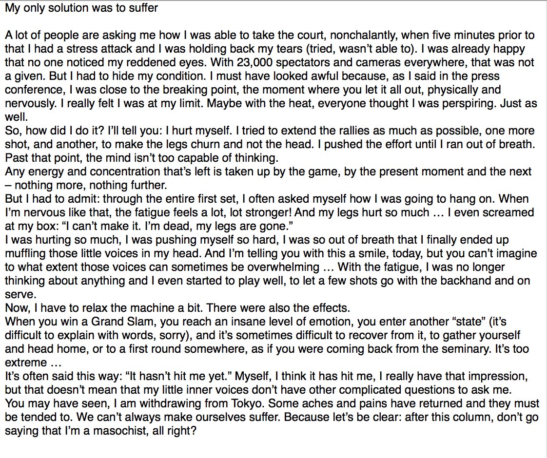 I could have written that myself. The guy's top form is beyond anything we've seen before -- literally. That's such a bold statement, but I believe it. It's actually really infuriating to watch at times. I'm like, "Nick, do you realize what people would give to be as good at tennis as you are? You gotta respect the gift, bro!"