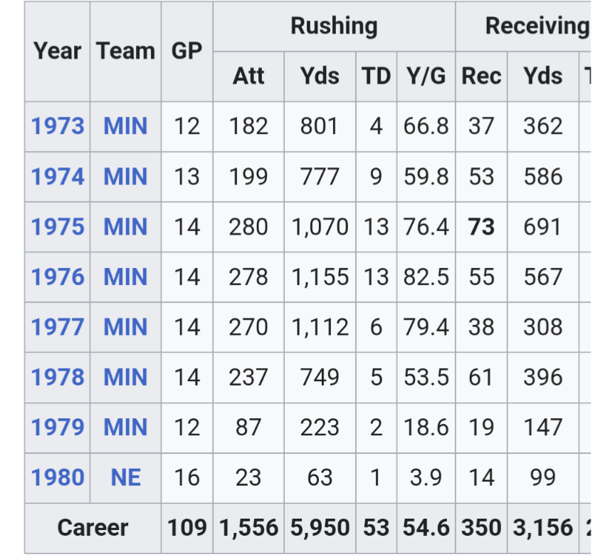 Not to completely derail the thread, but Chuck Foreman of the Vikes was probably the premier run/catch option in the 70s - even led the league one year in receptions.
