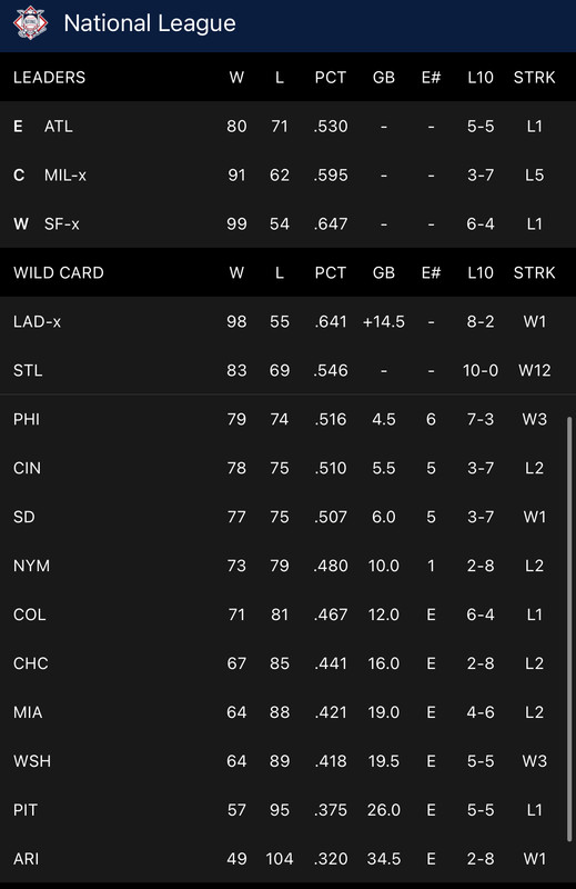 -Cards continue to be red hot and the NL field looks all but settled outside of who wins the NL West and possibly the NL East with a Braves/Phillies series looming ahead next week