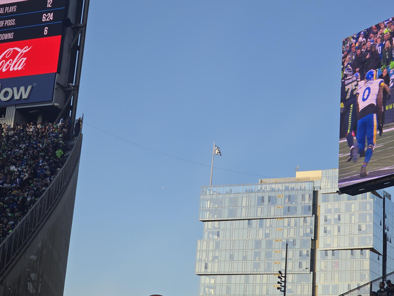 Mates look at these heckin TWELVES watching from The Wave, a 26-storey high-rise that stands directly behind the Hawks Nest at Lumen Field.