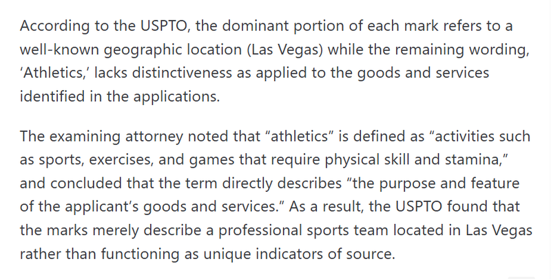The USPTO denied the trademarks for "Las Vegas Athletics" and "Vegas Athletics" on Dec 29, 2025, as they were deemed primarily geographically descriptive and not distinctive enough.