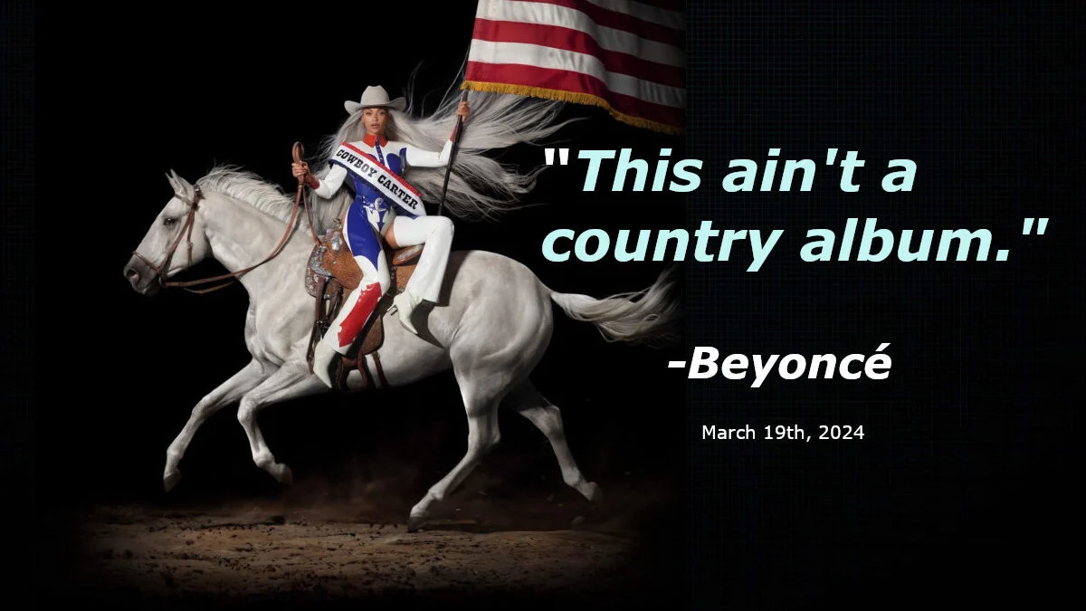 I say this Cowboy Carter crap Beyonce is putting out is not at all country music. Just because she's sensational in other genres doesn't mean she can simply put on a cowboy hat and some sparkly boots and call herself country.