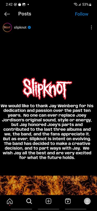 They are definitely making some weird decisions , getting rid of Craig the day after a show and announcing it right before they go on stage and now with Jay . They just finished their touring cycle so if I had to guess it was a money issue between Corey / Clown and not paying Jay what he either deserved and or wanted …..