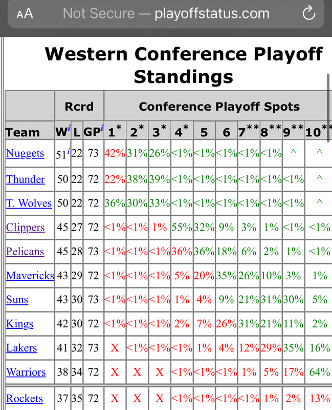 quote:6-8 are all within a game and only one of them get to avoid the play-in. 40% seems right for the moment considering if they beat SAC tonight their odds of play-in drop to 20%. Huge game for Mavs-Kings tonight.