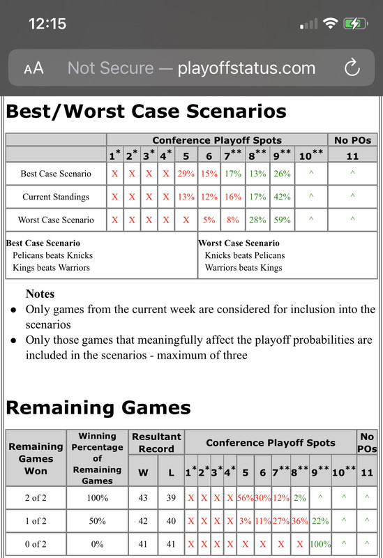 There's a few more options with GS going 0-2 for us to clinch the 5 or 6 seed, but I think everything above is the most likely outcomes possible. We win any tiebreaker scenario among the 5-8 teams where any 3 or more teams are tied with us (except if we are tied with both GSW and LAL, we end up at #7), and any scenario where we are tied only with GSW or LAC.