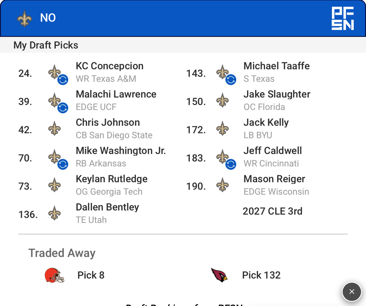 Picked up 2027 LAR 2nd and 2027 WAS 4th in trade-downs