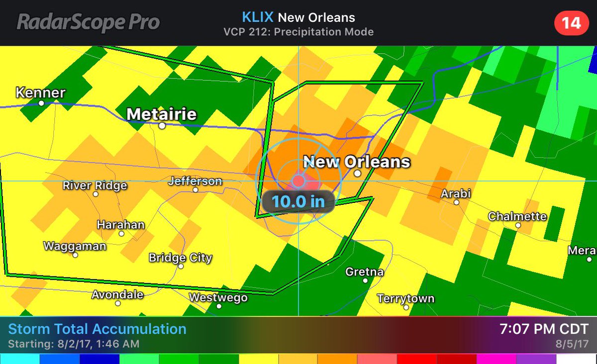Doppler radar rain total estimates 8-10" has fallen over #NewOrleans & that is why we are #flooding. #lawx @WWLTV