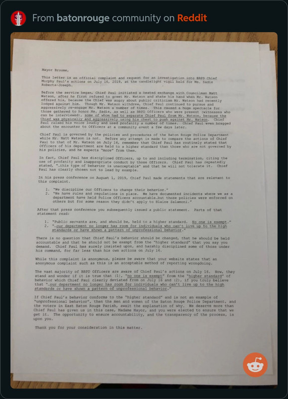 This letter is an official complaint and request for an investigation in BRPD Chief Murphy Paul’s actions on July 16, 2019, at the candlelight vigil held for Ms. Sadie Roberts-Joseph.
