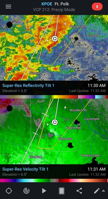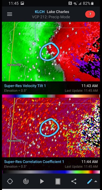 Harder to see on regular radar but you can still see the higher winds (orange-brown)