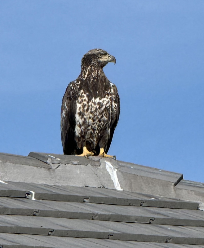 Just last week, this juvenile Bald Eagle was sitting on my neighbors house. Dude just sits up there and watches the pond. He watches everything. And all the other birds know he is there. You can tell.