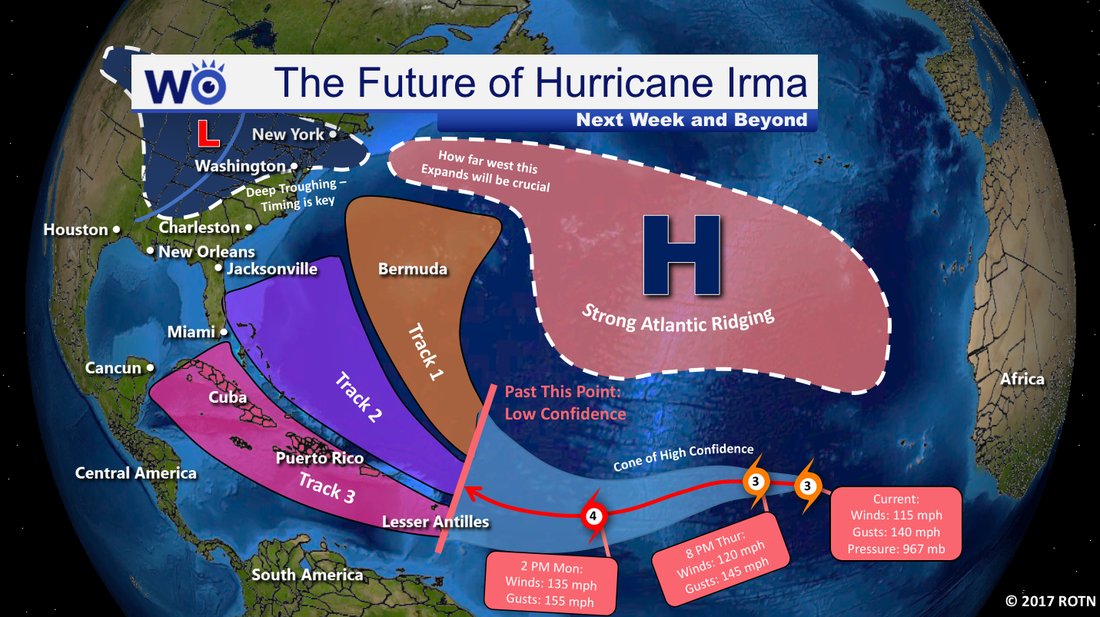 Irma needs to make that jog northwest at or before 52W. If it stays on a southwesterly track to 53W before turning north it starts becoming dicey for the east coast. It it goes to 54W, we likely have problems brewing for the GOM and south Florida.