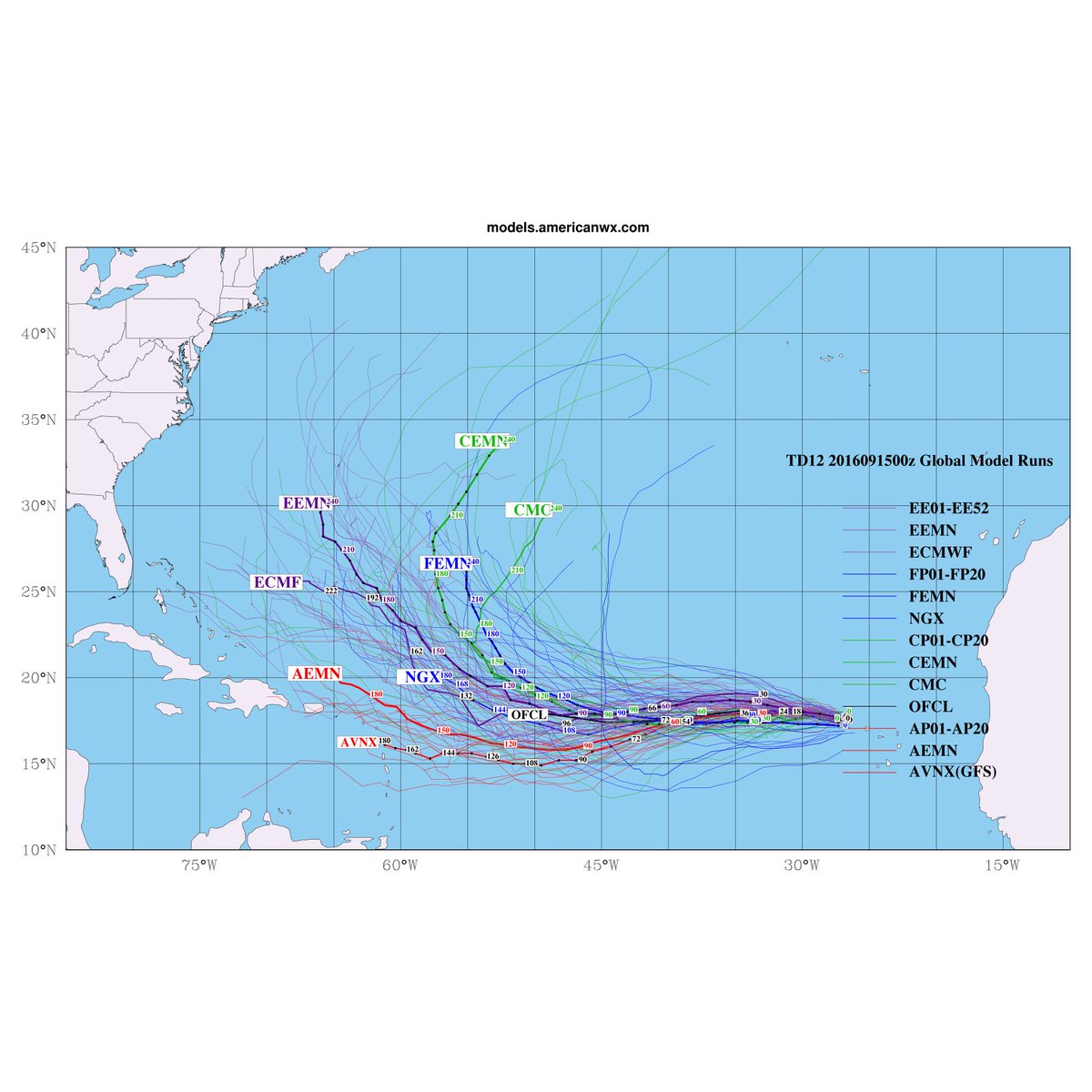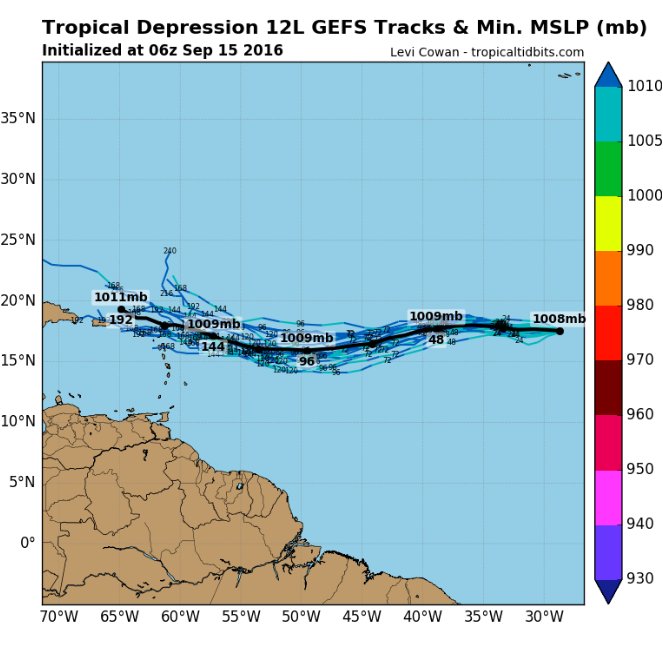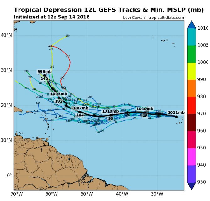 The models have started trending westward with TD12 but it still looks like it should eventually be able to escape out to sea. A weaker system probably takes the more westward track in the forecasted setup.