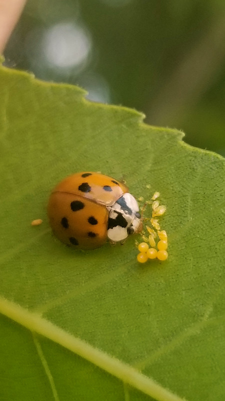 Not a roly-poly, but here's a ladybug doing what ladybugs do, eating aphid eggs: