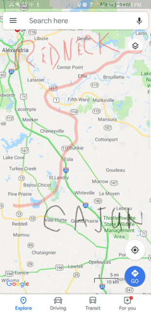 quote:A migration issue. Some cajuns moved a bit North over time while some rednecks were heading South.