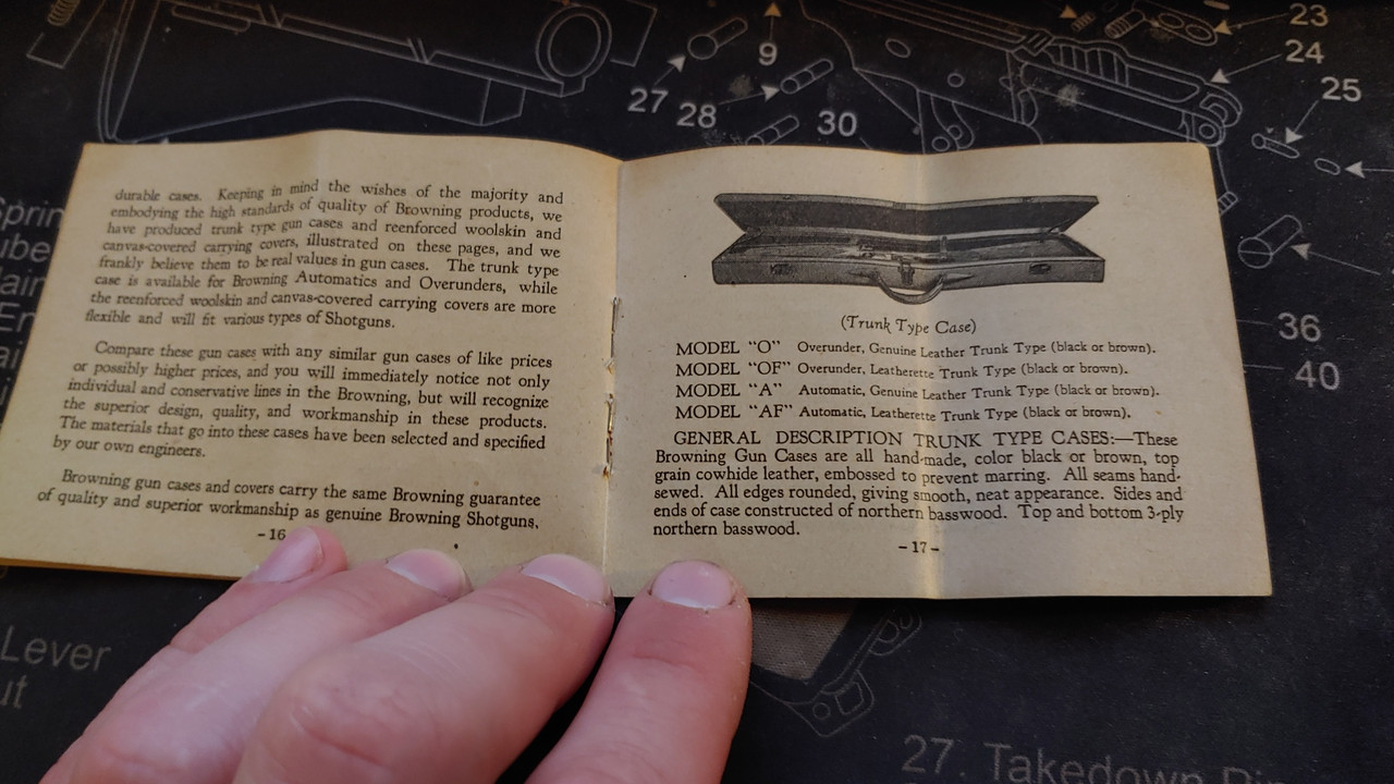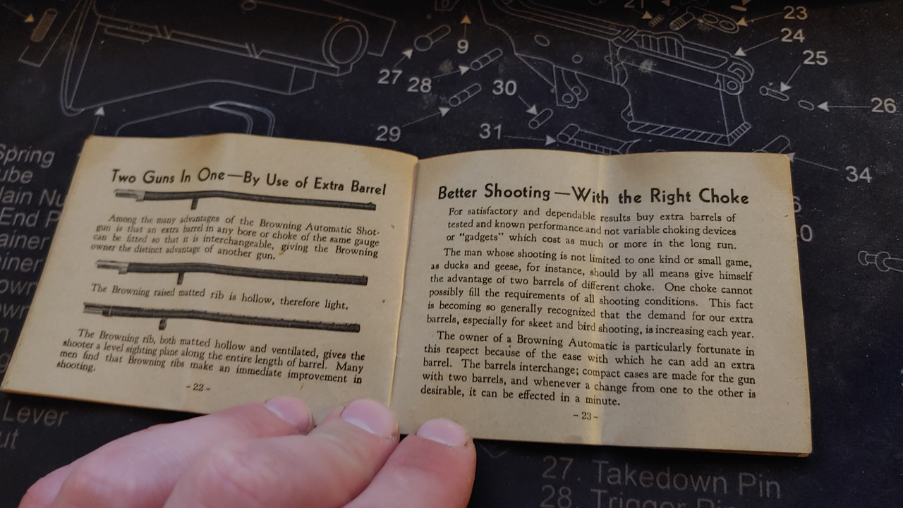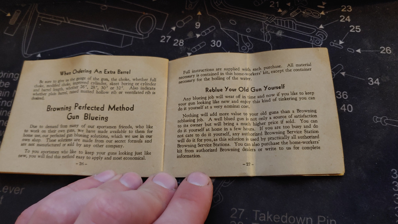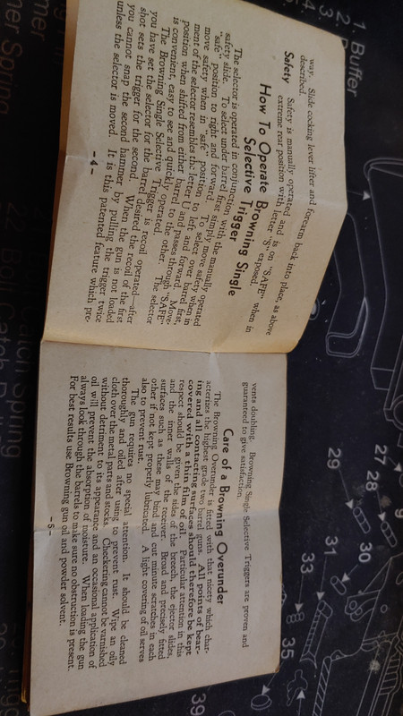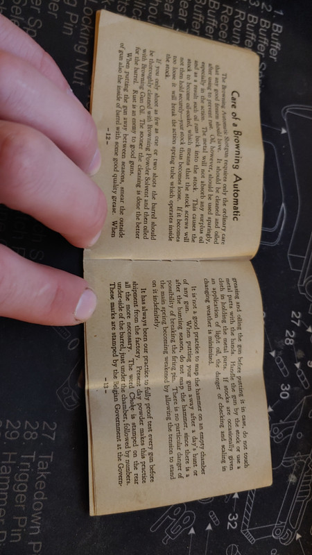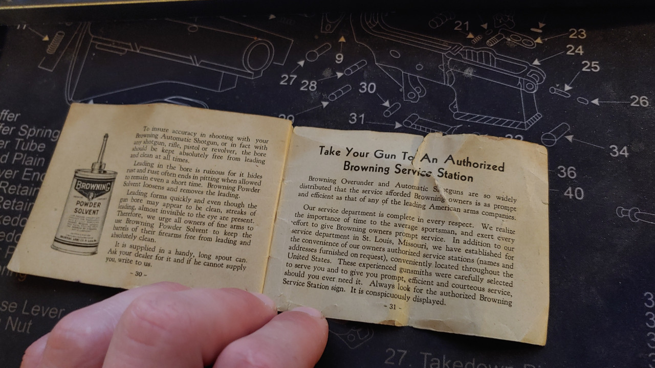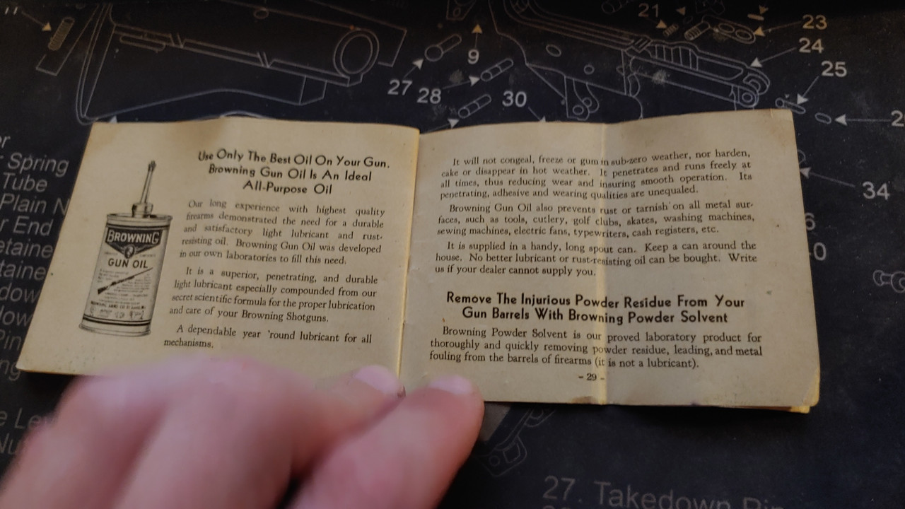 Hey man. Just found the original manual that came with my Grandfathers browning. Like others said before, they don't like too much oil. I always have used hoppes #9 in the bore and outside of the gun and wd40 in the action, wd40 keeps it running good into the single digit temps. Also, don't dry fire it, the firing pin might go flying out onto the ceiling.. Here's the photos of the manual.