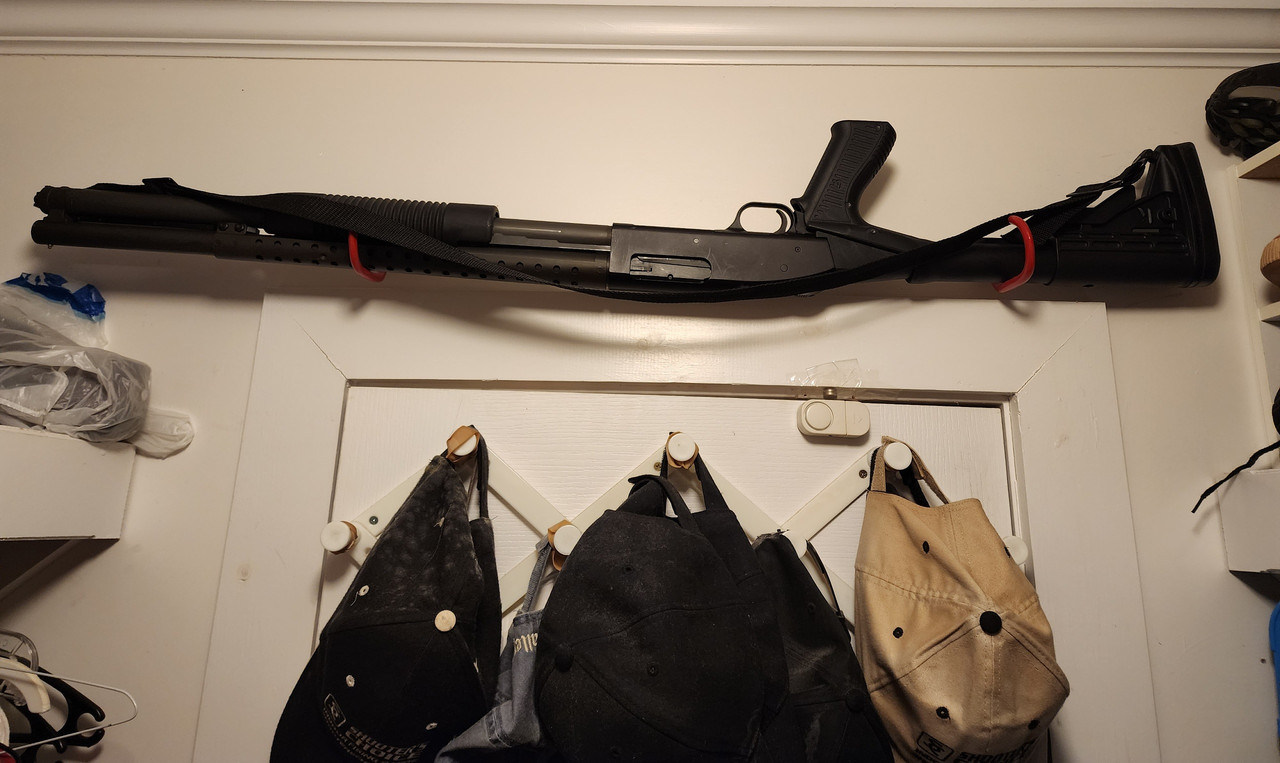 And the bicycle hooks work great for those of us over 6'3" or more .... just screw them into the header behind the sheetrock. I actually had to yank this one around 2005 or so, on some coyotes licking the dog bowls on the back deck when my old service GSD was getting old. Stinkin'est dead animals known to man. Two died, one flipped head over heels, shot in the arse, running down the steps ... I never found him but half of one of his balls was stuck to the handrail I had to replace.