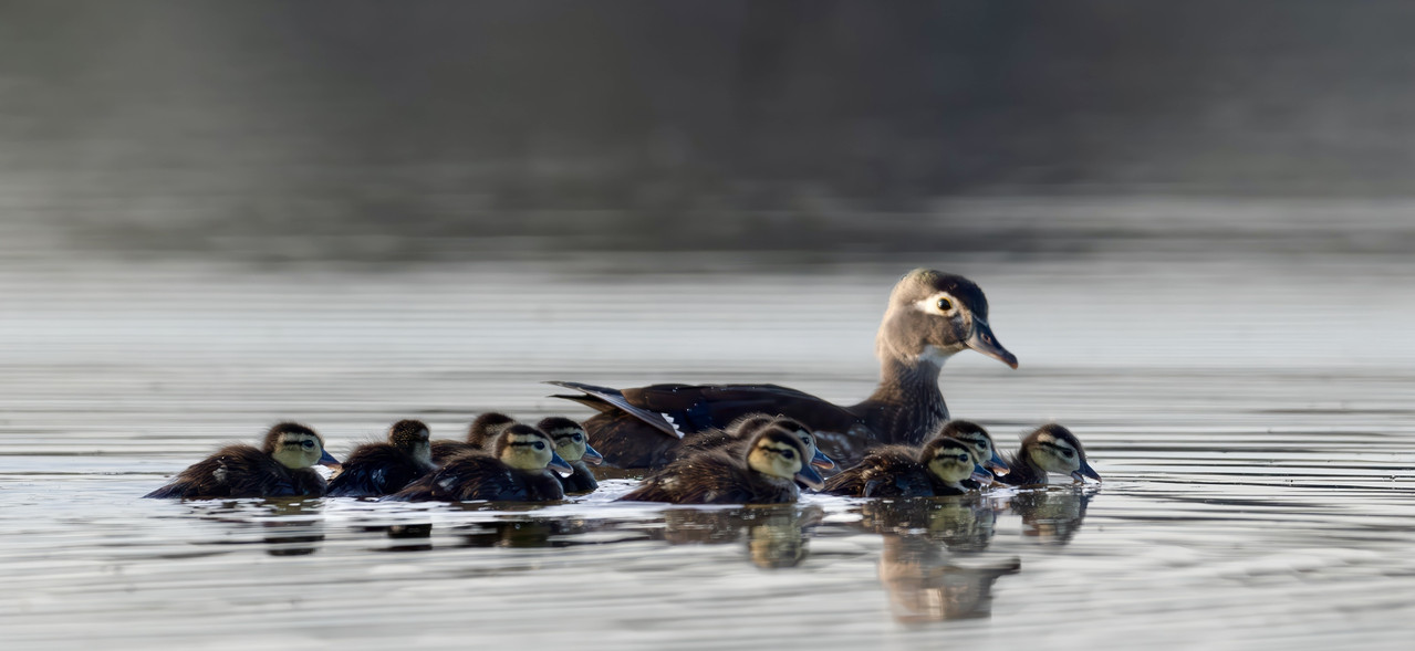 Brood #1 swam by this morning. Eleven little fuzz balls.