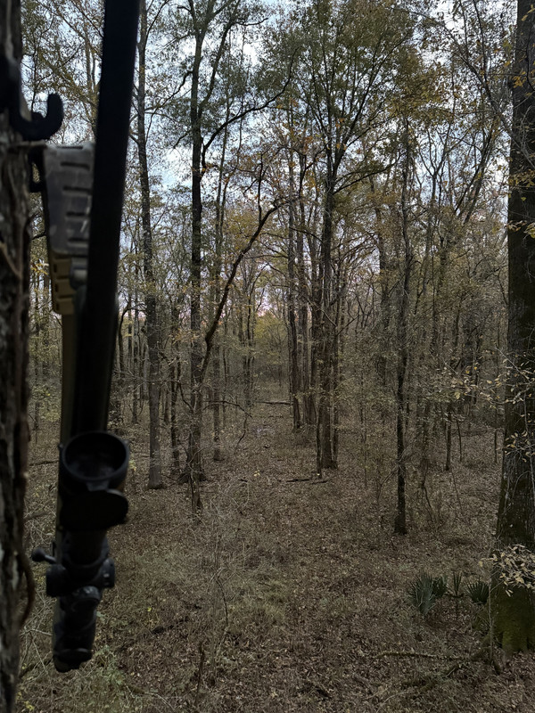 I'm hunting a road between a cutover and mature pines with my .30-06. It's 35 degrees with a beautiful sunrise. Saw 2 deer feeding on the side of the highway driving over here this morning. I'm wearing my heated socks but only one is working so that's nice.