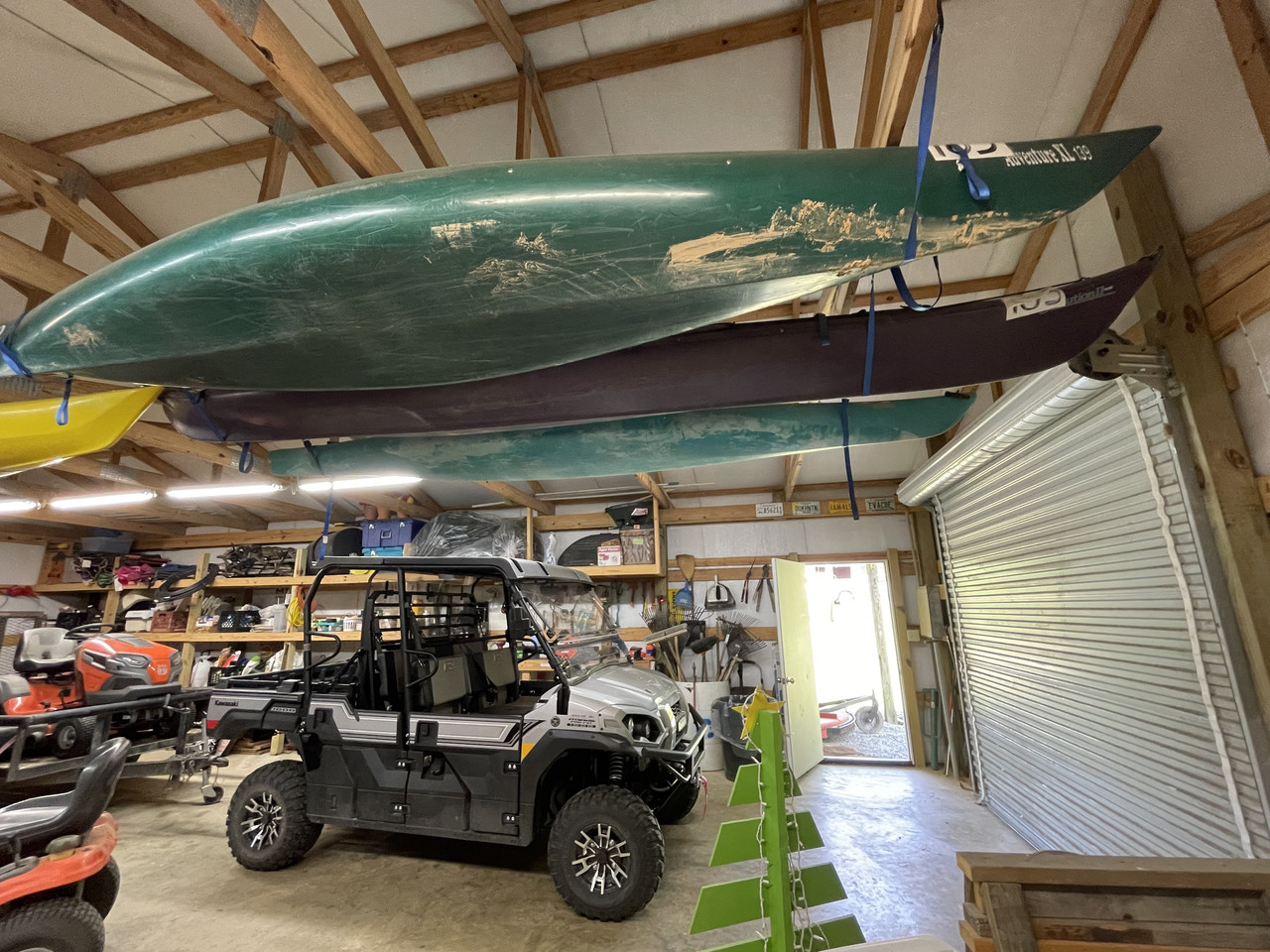 I’ve got four eye bolts (2 front/2back) screwed into the ceiling joists and two cam buckle straps as a cradle that snug my kayak right up to the ceiling.