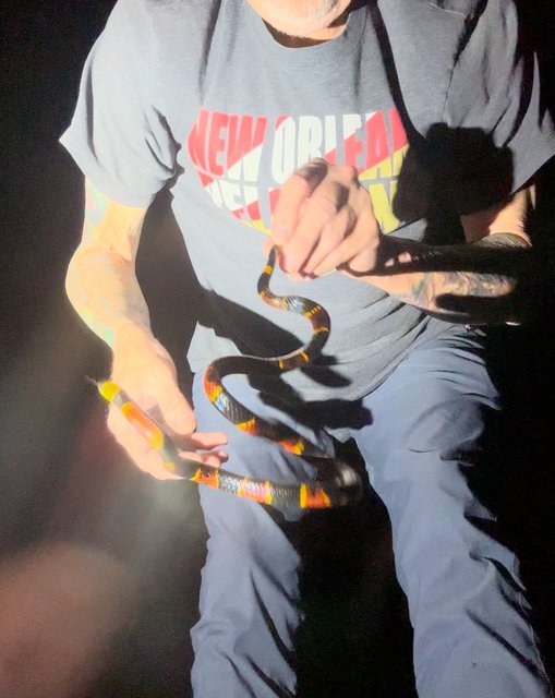 One thing about coral snakes, they don't have fangs like pit vipers. They would have to bite you an a finger or something to have any chance of injecting venom.