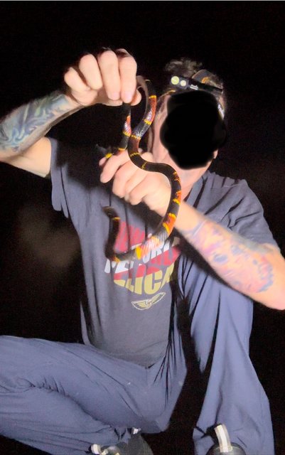 One thing about coral snakes, they don't have fangs like pit vipers. They would have to bite you an a finger or something to have any chance of injecting venom.