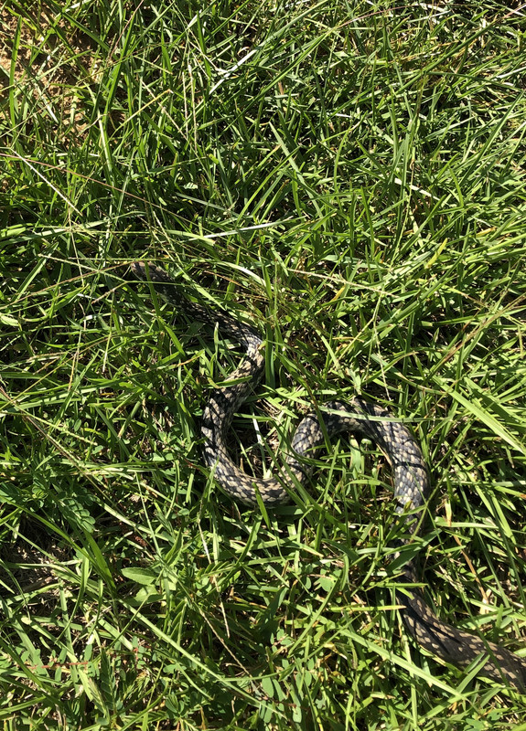 While prepping for our annual boil, I found a decent sized skin near the koi pond. Later, when the sun came out for a bit, I saw a beautiful Ribbon snake-freshly shed. We get a few each Spring-I think they winter in the mound where the water fall is.